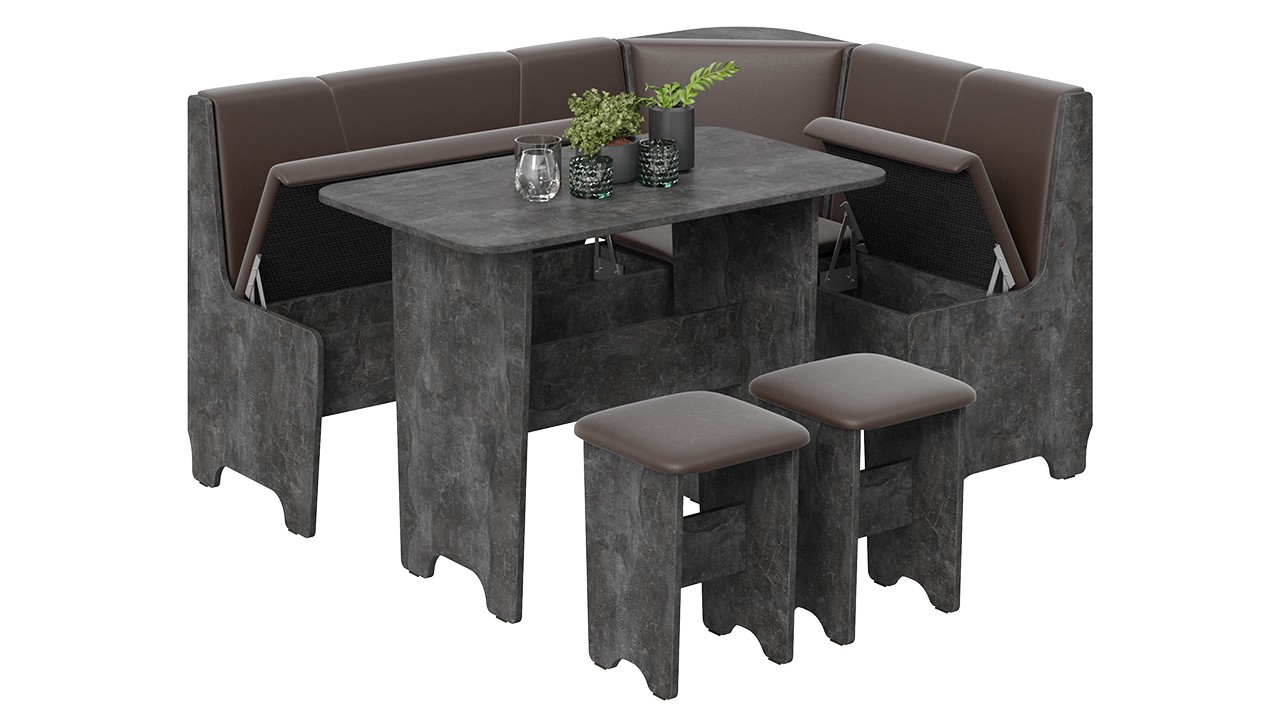 • Обеденная зона "Техас" состоит из удобной угловой скамьи, практичного стола и компактных табуретов.