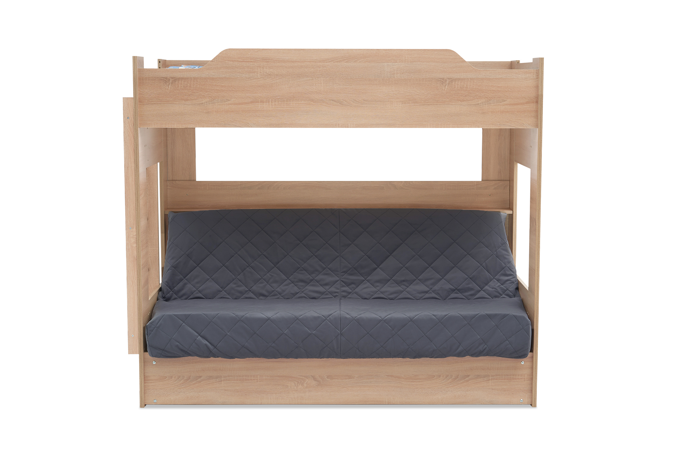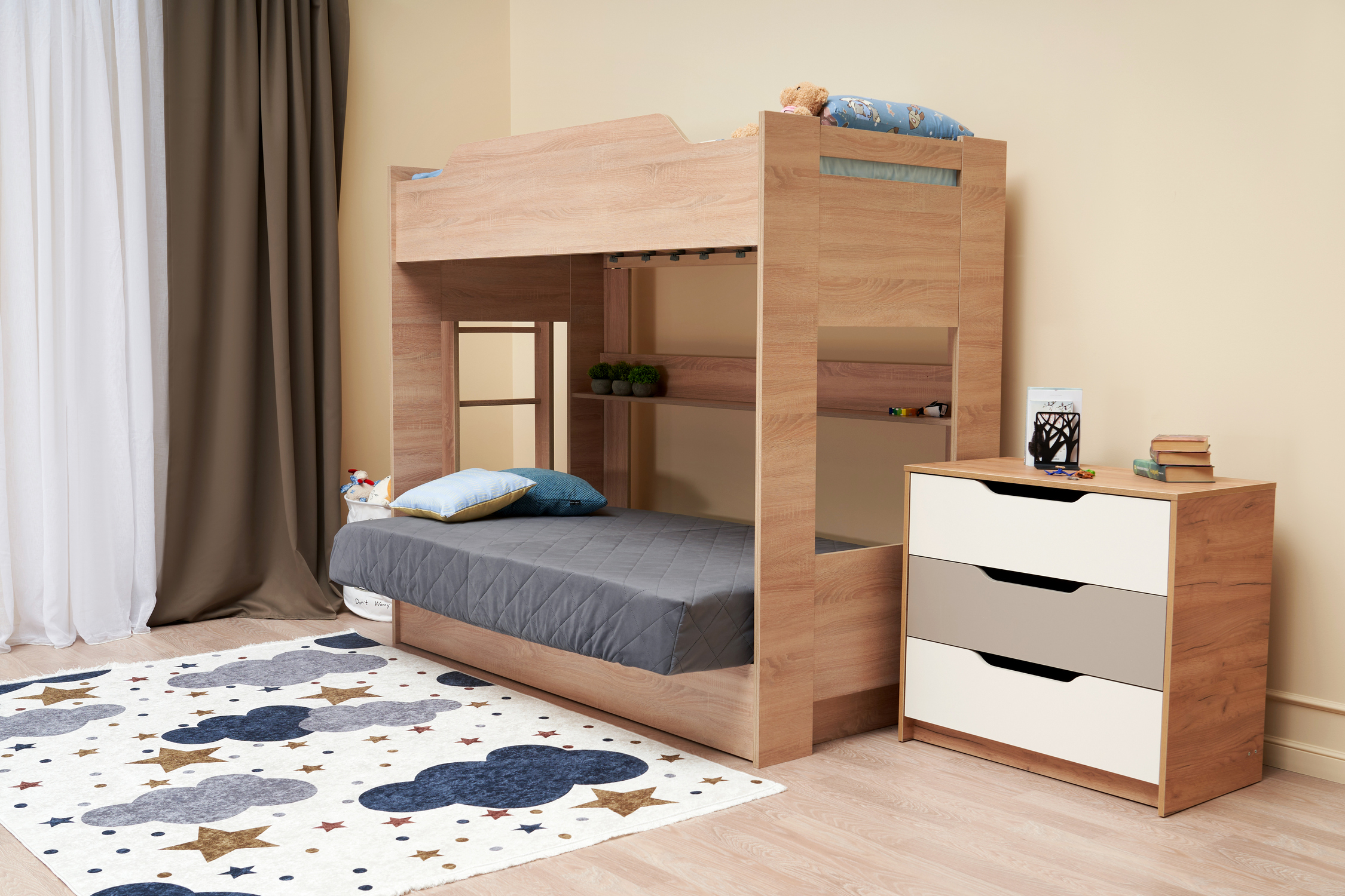 Механизм трансформации дивана: «Книжка». Рекомендуемая высота матраса на верхний ярус 17 см. Максимальная нагрузка на верхний ярус 50 кг. Лестница может быть установлена с обеих сторон кровати. Высота бортика 30 см. Максимальная нагрузка на нижний ярус 90 кг. Чехол съемный.